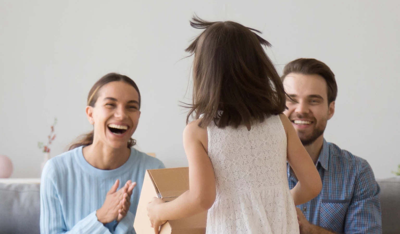 Man and girl playing with dog.